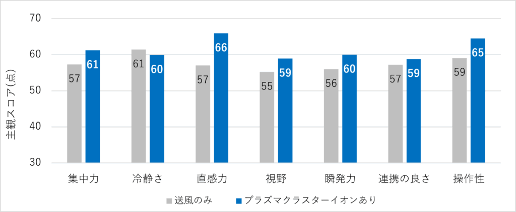 送風のみと比較し、プラズマクラスターイオンありの条件で、被験者が試合中にeスポーツに必要な能力の向上を実感していることを確認した。