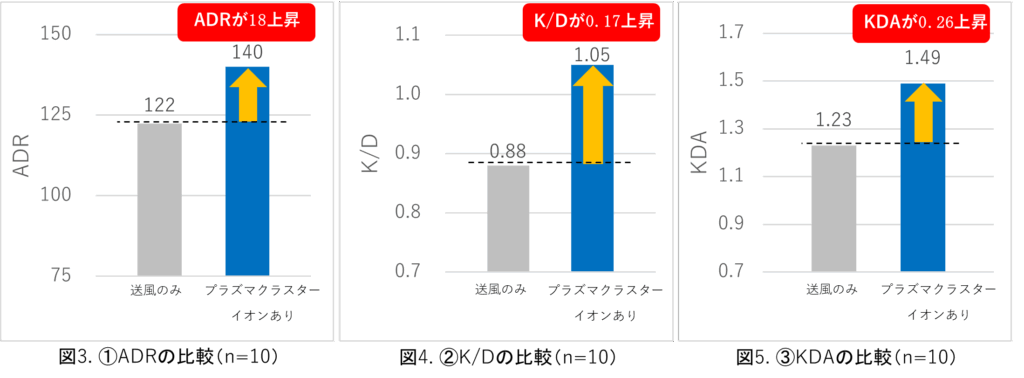 送風のみと比較し、プラズマクラスターイオンありの条件でADR、K/D、KDAの上昇を確認した。
